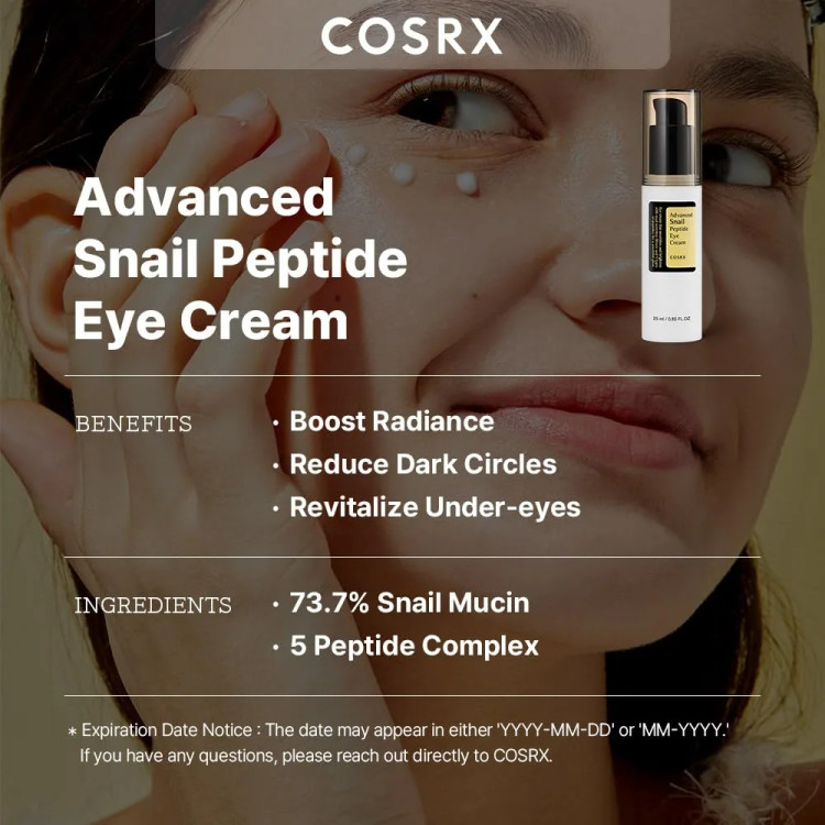 کرم دور چشم حلزون کوزارکس (COSRX Advanced Snail Peptide Eye Cream) یک محصول مراقبتی پیشرفته است که با ترکیبی منحصربهفرد از موسیِن حلزون خالص ۷۲٪ و ۵ نوع پپتید مغذی، به طور مؤثری چینوچروکها، تیرگی و پف اطراف چشم را کاهش میدهد. این کرم، علاوه بر آبرسانی عمیق، خاصیت ترمیمکنندگی بالایی دارد و باعث افزایش خاصیت ارتجاعی و شادابی پوست میشود.