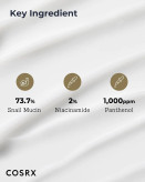 - موسیِن حلزون (۷۲٪): حاوی آلانتوئین، آنزیمهای ضدالتهابی، پروتئینهای بازسازیکننده و اسیدهای آمینه که به ترمیم پوست، تقویت سد محافظتی و افزایش لطافت آن کمک میکند.