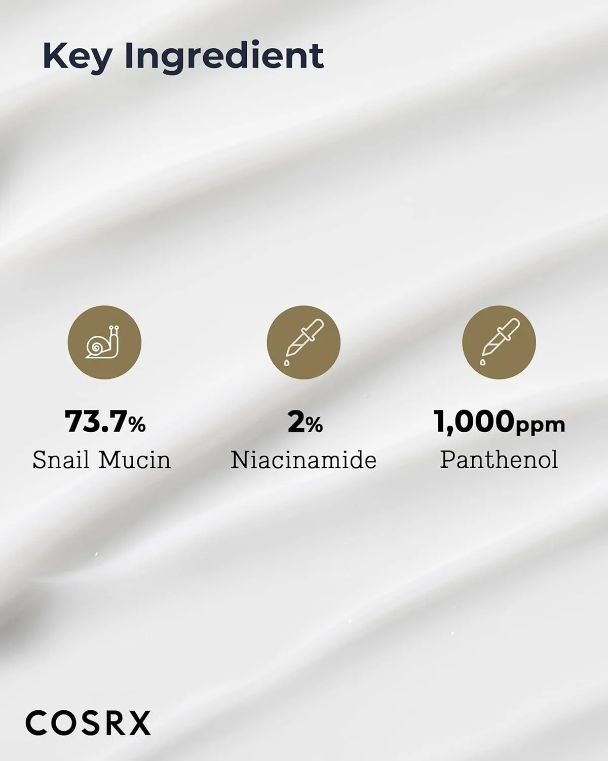 - موسیِن حلزون (۷۲٪): حاوی آلانتوئین، آنزیمهای ضدالتهابی، پروتئینهای بازسازیکننده و اسیدهای آمینه که به ترمیم پوست، تقویت سد محافظتی و افزایش لطافت آن کمک میکند.